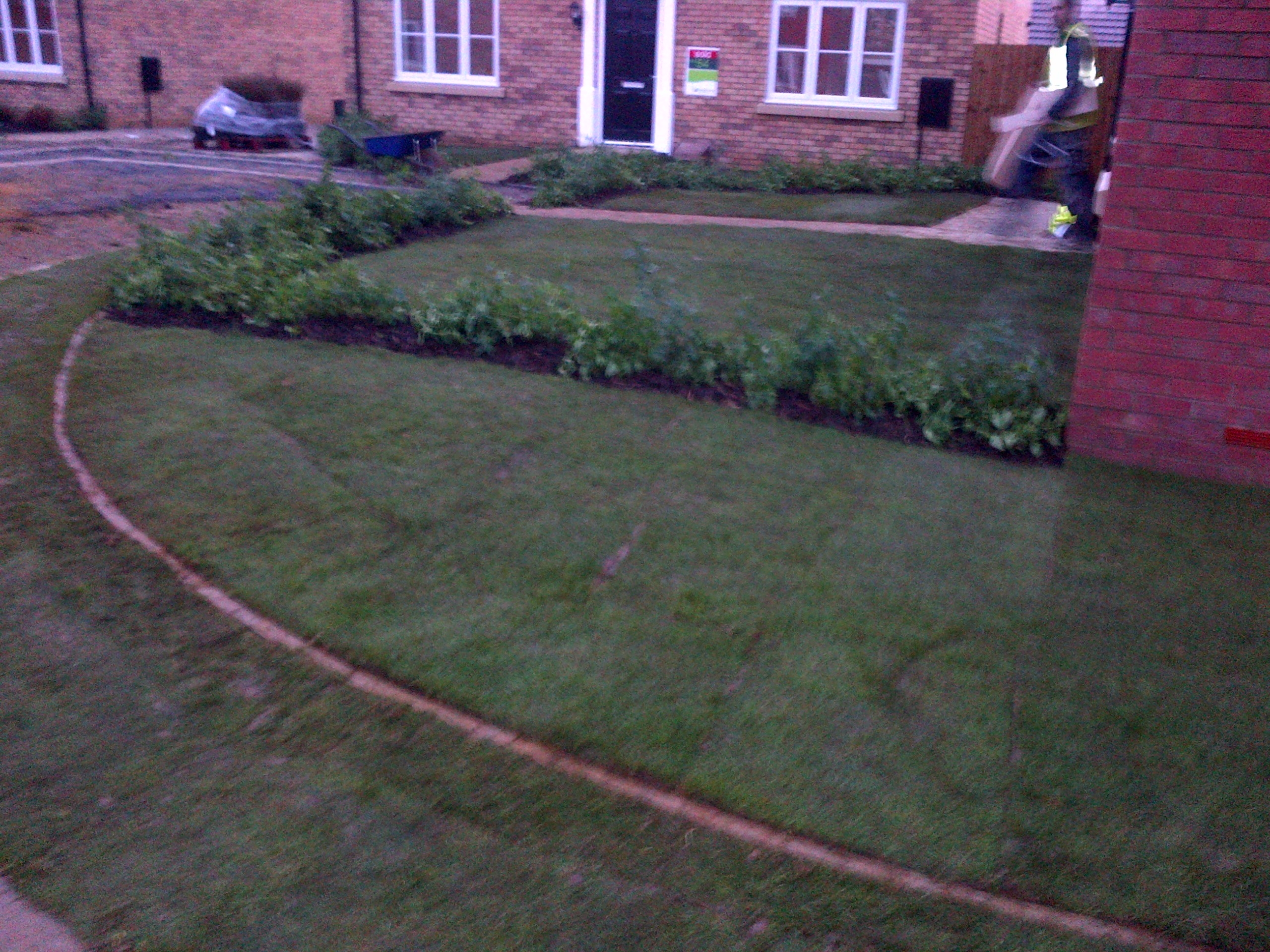 New build plot turfed, shrub beds planted and finished with bark mulch.